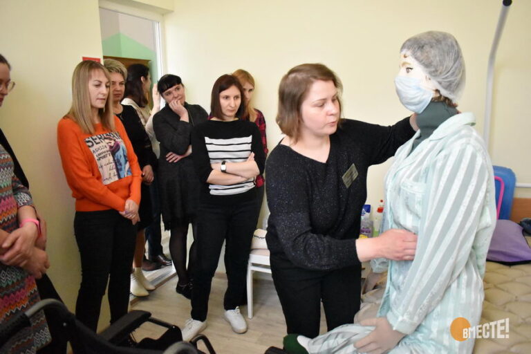 На локации «Использование средств реабилитации в уходе» специалист ТЦСОН Борисовского района рассказала гостям мероприятия о правильном уходе за тяжелобольными: показала, как правильно проводить гигиенические процедуры на манекенах и какие использовать при этом средства. Перемещать человека с кровати в инвалидную коляску участники квеста практиковались на «Светлане» – 70-килограммовом манекене, которого сотрудники центра сделали для практического обучения.