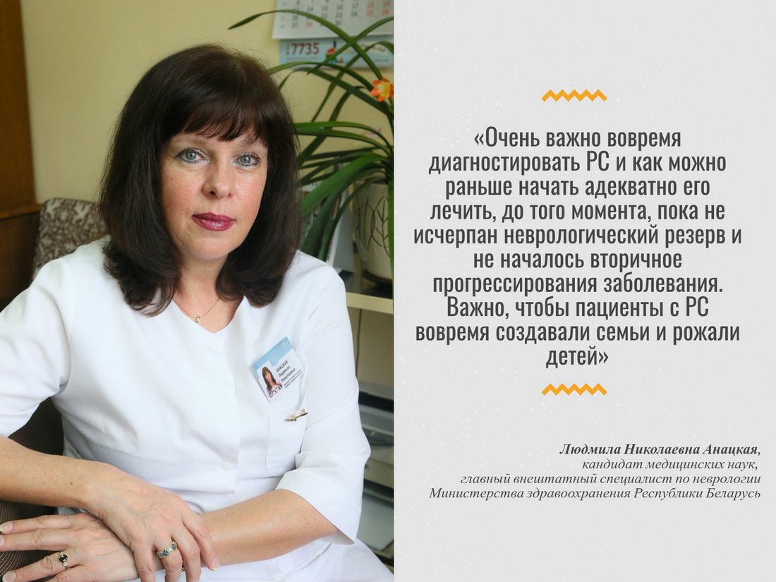 − Своевременная диагностика РС и раннее назначение адекватного персонифицированного лечения препаратами, изменяющими течение рассеянного склероза (ПИТРС), позволяют предупредить развитие обострений, значительно замедляют прогрессирование заболевания и инвалидизацию пациентов. С 2018 года в Республике Беларусь неврологическая помощь пациентам детского и взрослого возрастов с рассеянным склерозом оказывается согласно клиническим протоколам, разработанным на основе современных международных рекомендаций. В Республике разработана маршрутизация оказания медицинской помощи пациентам с рассеянным склерозом на амбулаторно-поликлиническом и стационарном этапах на районном, городском, областном и республиканском уровнях. В рамках государственной программы пациентам бесплатно проводится контролируемое лечение ПИТРС с благоприятным профилем безопасности и различной степенью эффективности. Наличие достаточного выбора ПИТРС позволяет персонально подходить к ведению каждого пациента, что особенно важно при лечении такого заболевания, как рассеянный склероз, отличающегося разнообразием клинических фенотипов заболевания. Всем пациентам с РС с момента назначения ПИТРС проводится регулярный плановый мониторинг активности и инвалидизации заболевания путем регулярной клинической оценки выраженности неврологического дефицита с учетом стандартных неврологических шкал и оценки динамики данных МРТ-исследования головного и спинного мозга. При любых признаках активности заболевания, его прогрессировании, увеличении инвалидизации своевременно принимается решение о смене ПИТРС. Очень важно вовремя диагностировать РС и как можно раньше начать адекватно его лечить, до того момента, пока не исчерпан неврологический резерв и не началось вторичное прогрессирования заболевания. Важно, чтобы пациенты с РС вовремя создавали семьи и рожали детей, − отметила Людмила Анацкая, главный внештатный специалист по неврологии Министерства здравоохранения Республики Беларусь, кандидат медицинских наук.