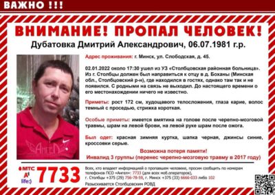 41-летний житель Минска – Дубатовка Дмитрий. С просьбой разыскать мужчину (он инвалид ІІІ группы) к нам обратилась знакомые семьи. По их словам, пропавшего видели последний раз 2 января этого года в Столбцовском районе. Туда он вместе с отцом приехал к родственникам. В какой-то момент младшему мужчине стало плохо – его… Подробнее »»